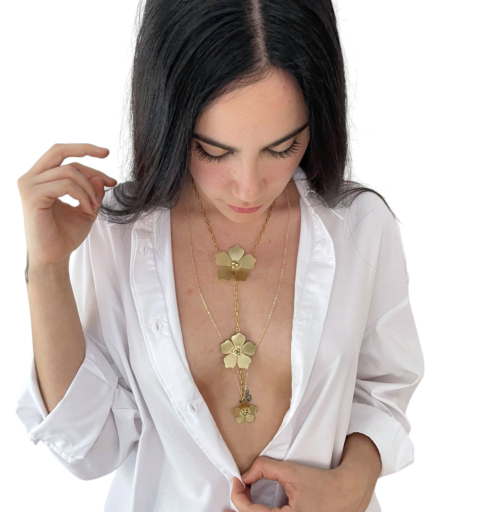 El collar presenta tres flores de diferentes tamaños que cuelgan de una fina cadena, creando una cascada floral que se adapta perfectamente a cualquier escote.