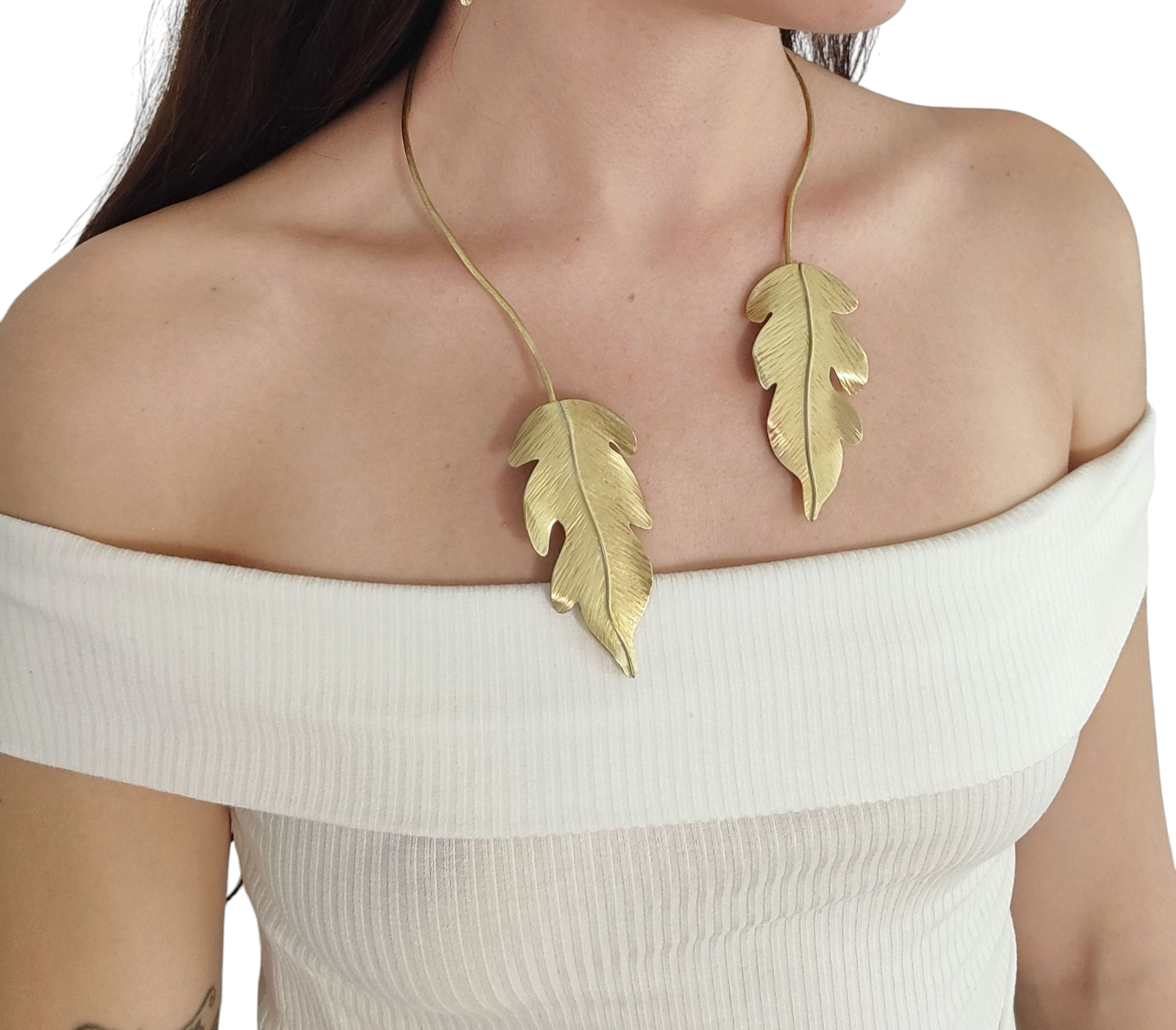 Esta gargantilla única presenta un diseño rígido y sofisticado, inspirado en la majestuosa hoja de roble.