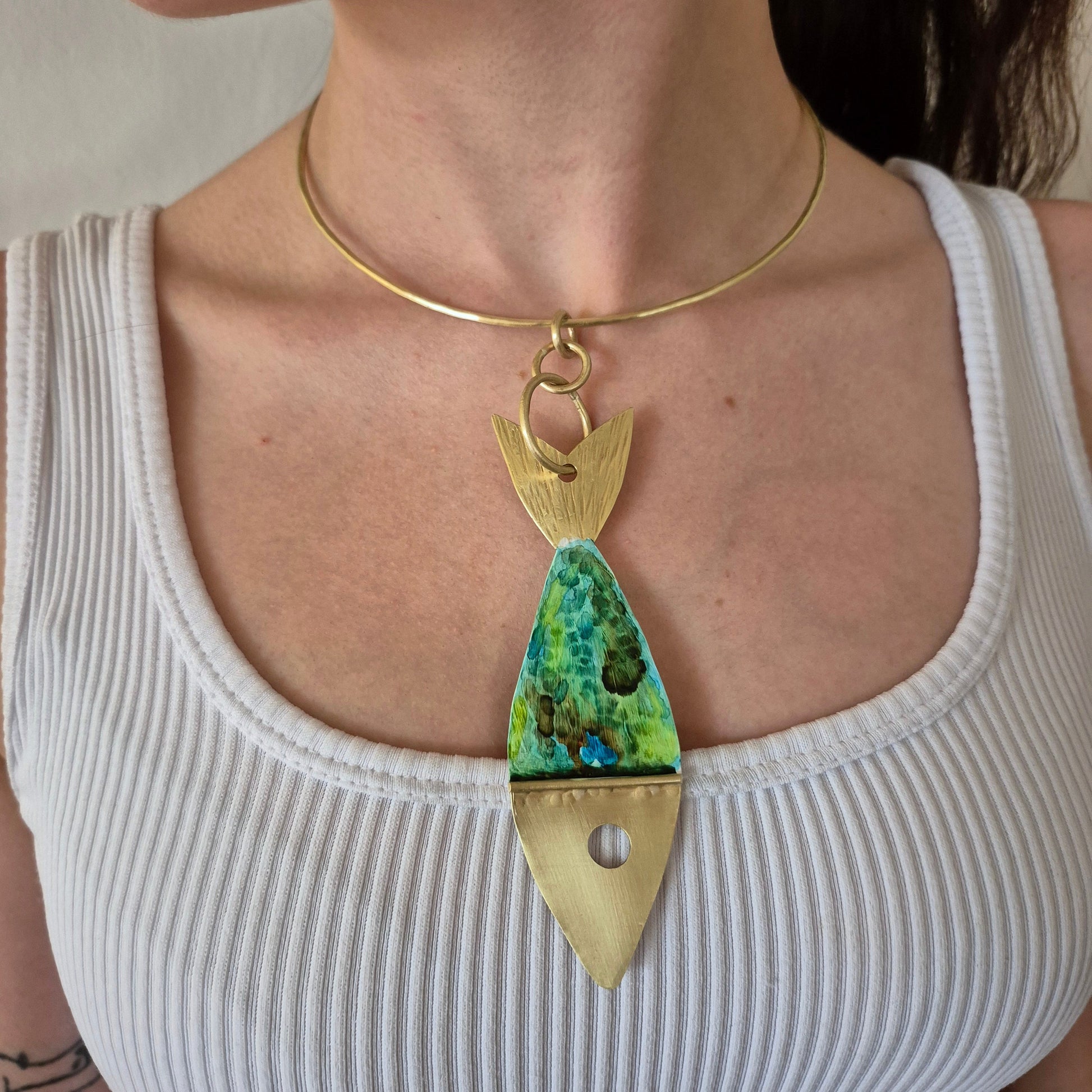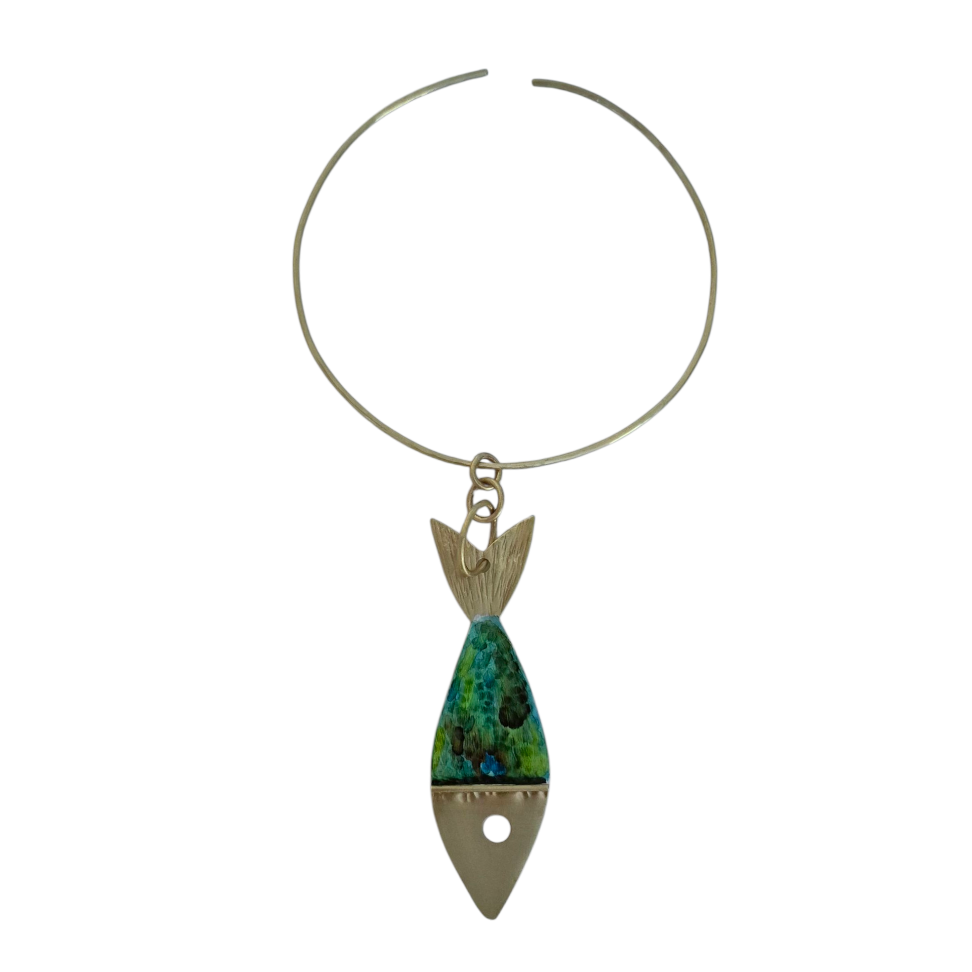 Gargantilla artesanal elaborada con técnicas tradicionales de joyería y pintada con acuarelas. Presenta un delicado pez chicharro en bronce con diseño minimalista que captura la esencia marina. El aro rígido de 2 mm de grosor se adapta perfectamente a tu cuello, ofreciendo comodidad y un ajuste personalizado. Cada pieza es única, resultado del trabajo manual cuidadoso que garantiza calidad y autenticidad. Una joya versátil que combina elegancia natural con la calidez del trabajo artesanal.