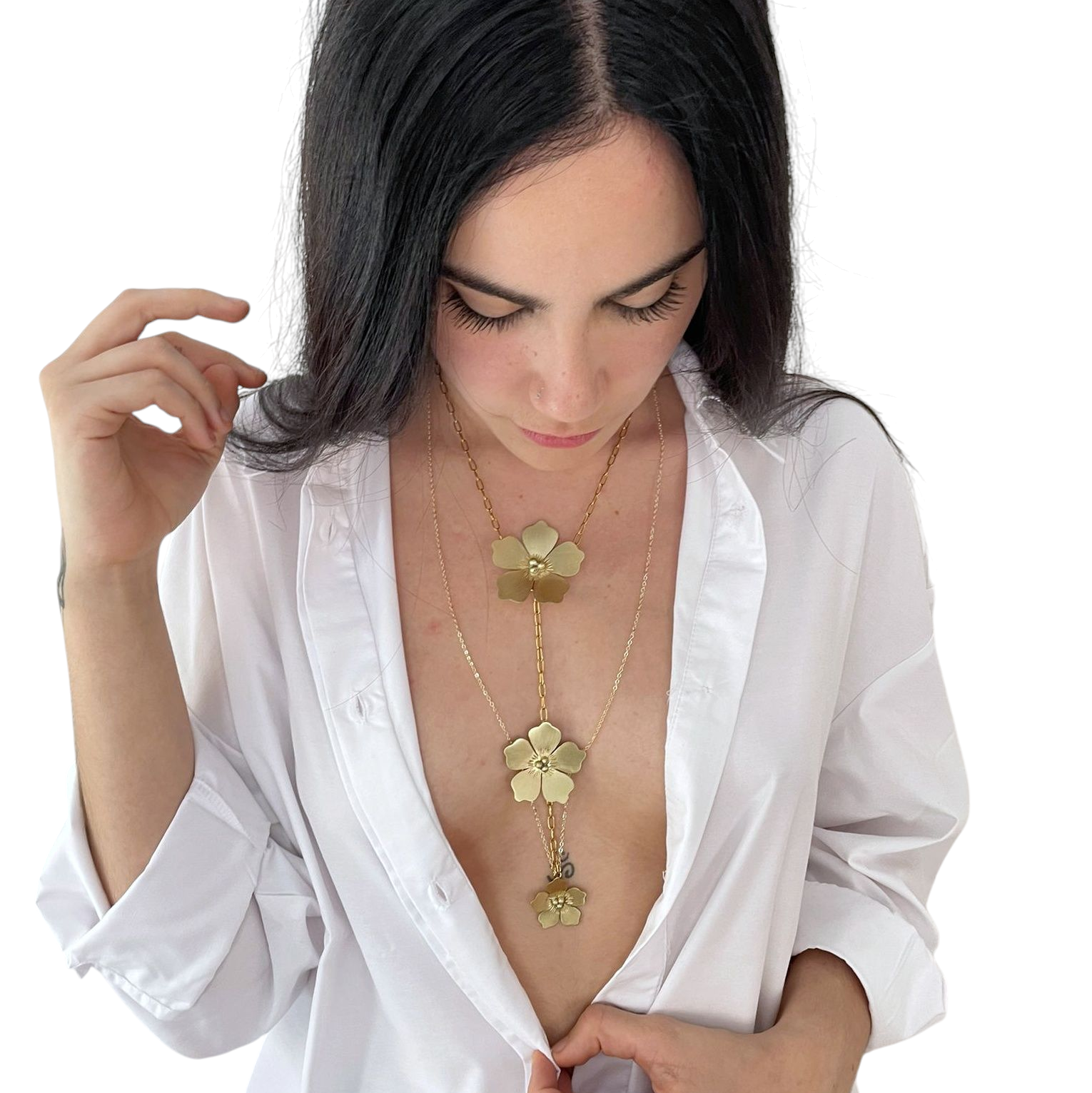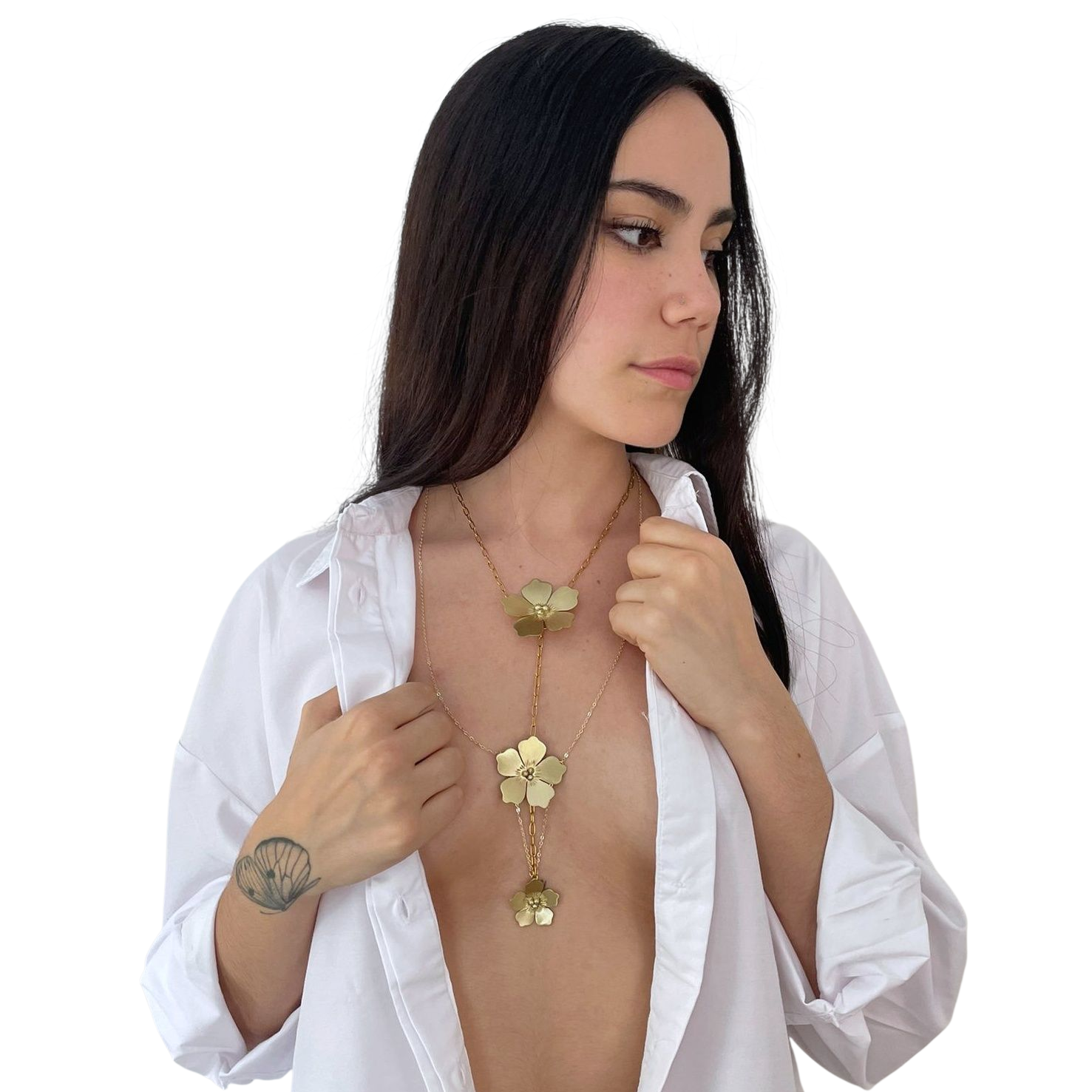 Descubre la elegancia en movimiento con nuestro Colgante Largo Floreciendo. Este collar singular presenta tres flores en distintos tamaños que crean un efecto visual cautivador. Elaborado en bronce mediante técnicas de joyería clásica, combina tradición con modernidad. Cuenta con protector libre de níquel y dos tipos de eslabones en acero inoxidable de alta calidad, garantizando durabilidad y comodidad. Su diseño versátil se adapta a múltiples medidas, permitiéndote experimentar con diferentes escotes y estilos. Perfecto para quien busca un complemento auténtico y diferente que refleje su personalidad única.