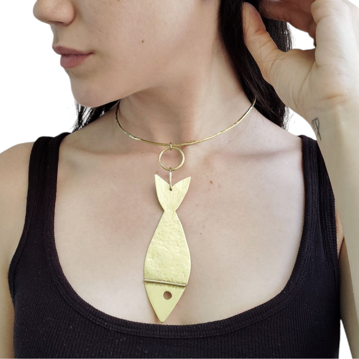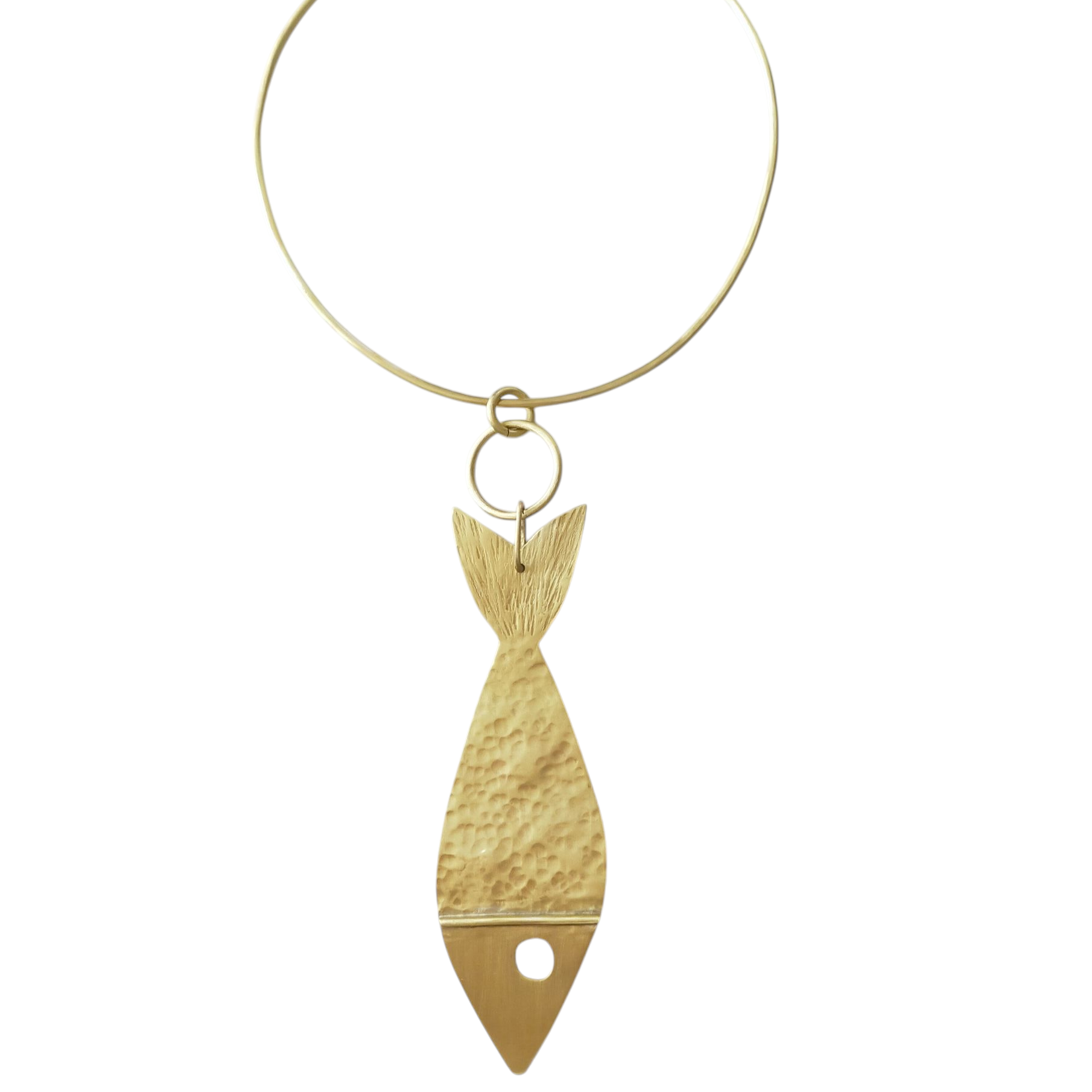 Gargantilla artesanal elaborada con técnicas tradicionales de joyería. Presenta un delicado pez chicharro en bronce con diseño minimalista que captura la esencia marina. El aro rígido de 2 mm de grosor se adapta perfectamente a tu cuello, ofreciendo comodidad y un ajuste personalizado. Cada pieza es única, resultado del trabajo manual cuidadoso que garantiza calidad y autenticidad. Una joya versátil que combina elegancia natural con la calidez del trabajo artesanal.