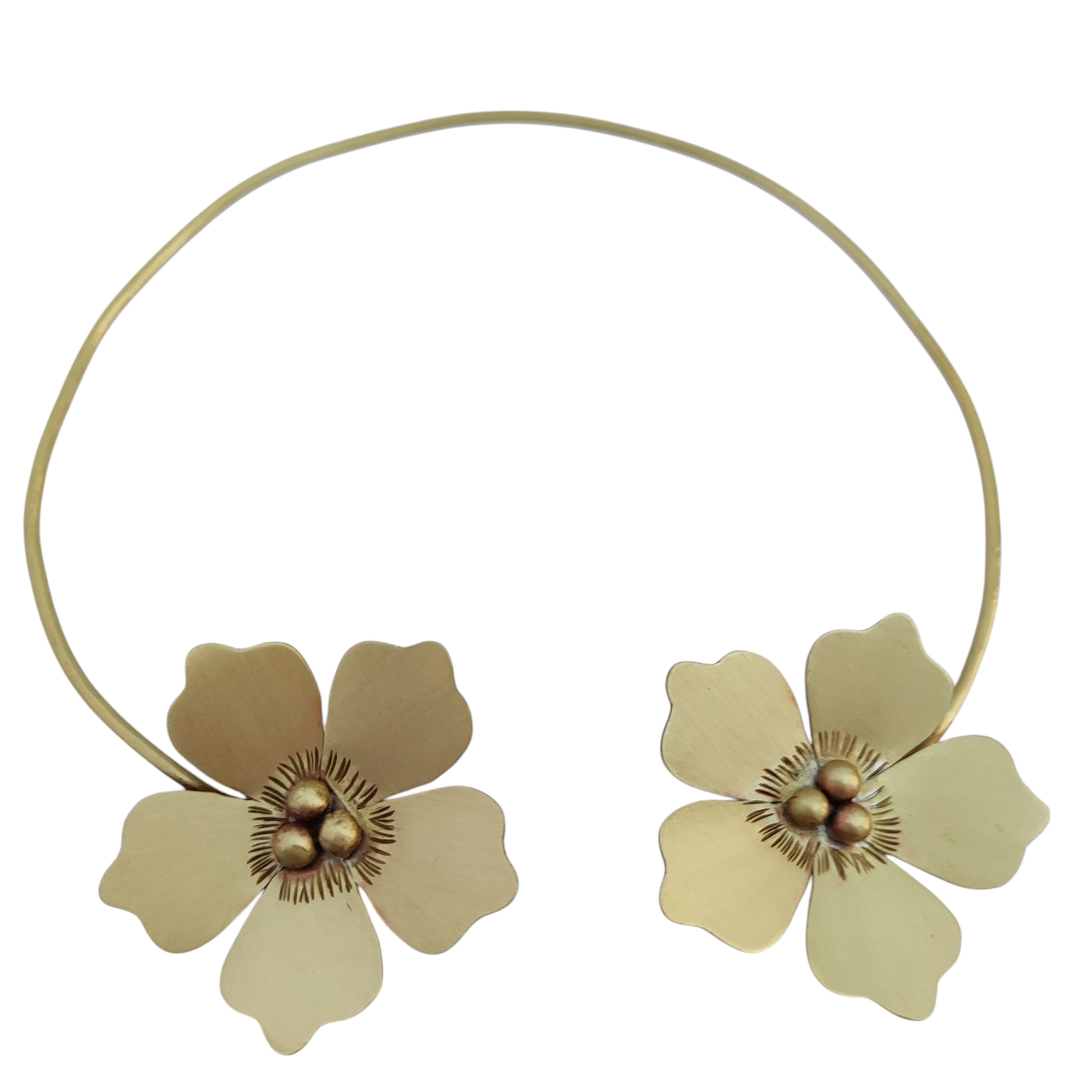 Gargantilla rígida artesanal que abraza elegantemente tu cuello con dos flores delicadas y florecientes. Elaborada con técnicas clásicas de joyería y acabado libre de níquel para mantener su brillo intacto. Su diseño minimalista y sofisticado se adapta a múltiples estilos, desde lo casual hasta lo formal. Combínala con un collar de perlas para un efecto aún más divino. Una pieza versátil que realza cualquier look con sencillez y gracia.