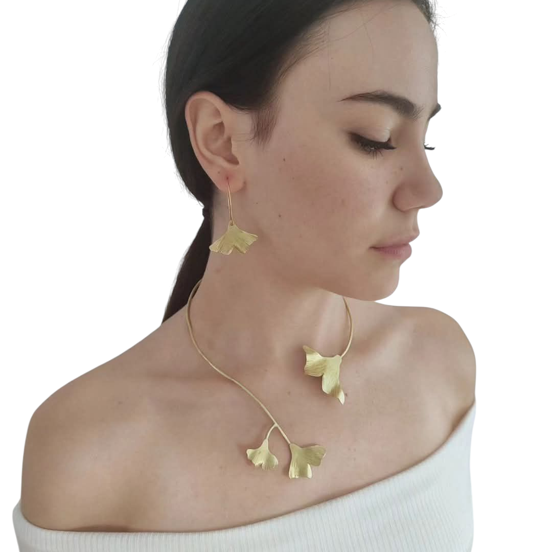 Gargantilla rígida que captura la elegancia natural de las hojas de ginkgo. Tres hojas en diferentes tamaños se entrelazan en un diseño que se adapta perfectamente a tu cuello. Elaborada en bronce mediante técnicas artesanales de joyería clásica, combina sofisticación con versatilidad. Úsala en tu día a día para un toque de naturaleza refinado, o lúcela con un vestido especial en tus momentos más importantes. Una pieza única que celebra la belleza de la artesanía.