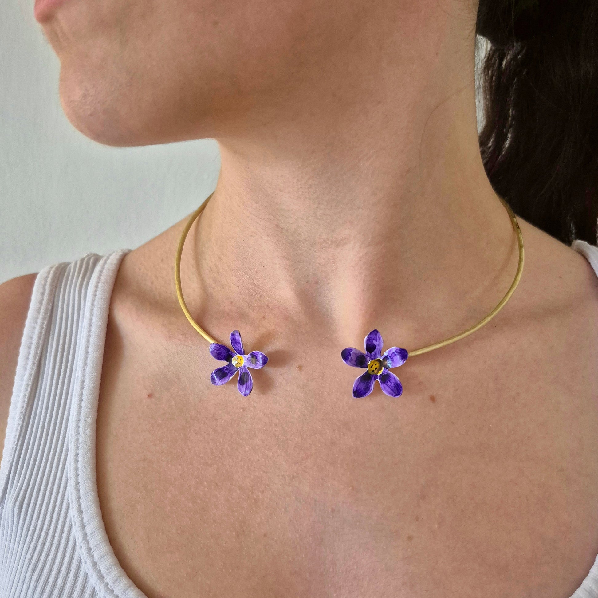 Una pieza de joyería que encarna la elegancia artesanal. Esta gargantilla rígida combina la tradición de técnicas clásicas con la delicadeza de la acuarela, donde tonos violeta inspiran la belleza de las violetas del Teide. Confeccionada íntegramente a mano, su aro de hilo redondo de 2 mm ofrece una estructura refinada y cómoda. El acabado libre de níquel protege tanto la integridad de cada pincelada, asegurando que la gargantilla perdure en el tiempo.