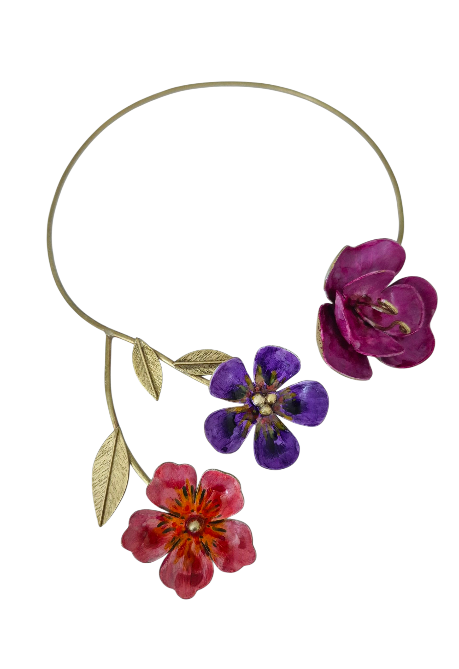 Collar rígido de bronce adornado con delicadas flores pintadas manualmente. Esta pieza artesanal combina elegancia clásica con un toque de color vibrante en tonos azules. Perfecta para quienes buscan una joya única que refleje su personalidad y aprecio por el trabajo hecho a mano. Un accesorio versátil que complementa tanto looks casuales como más sofisticados.