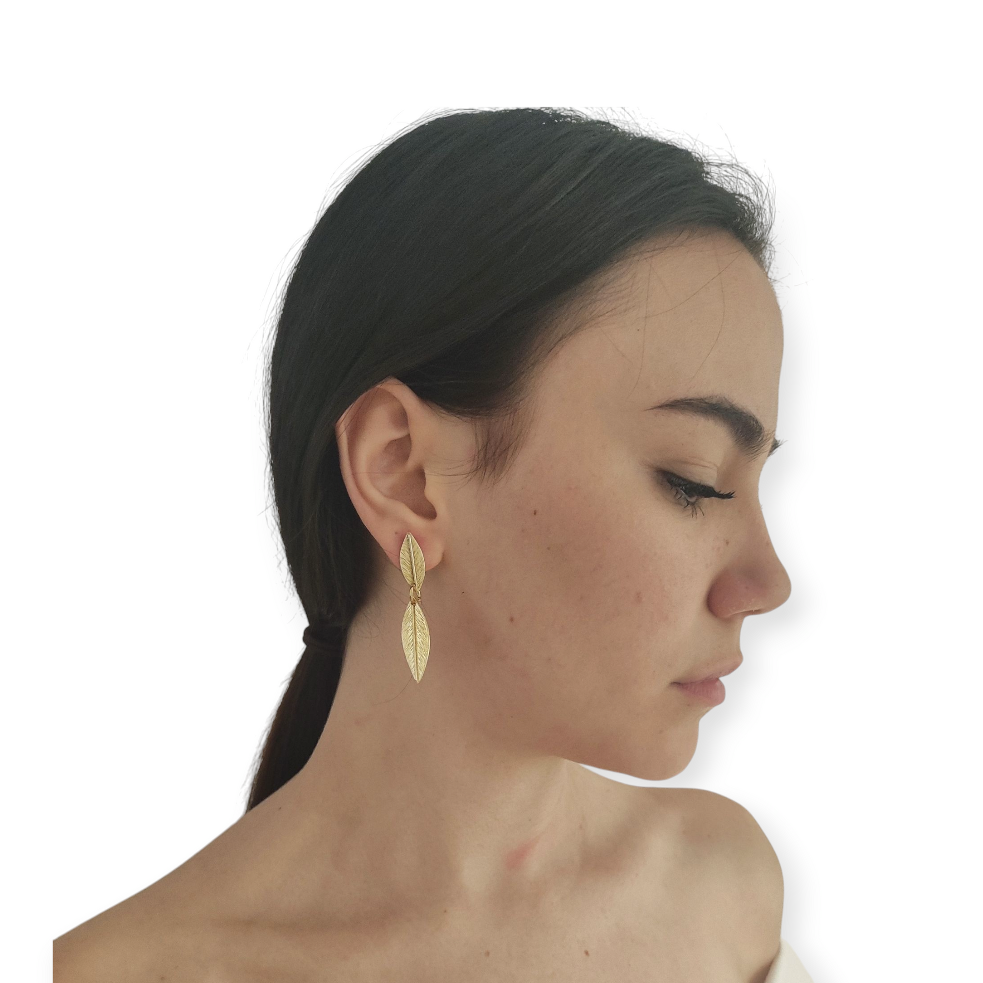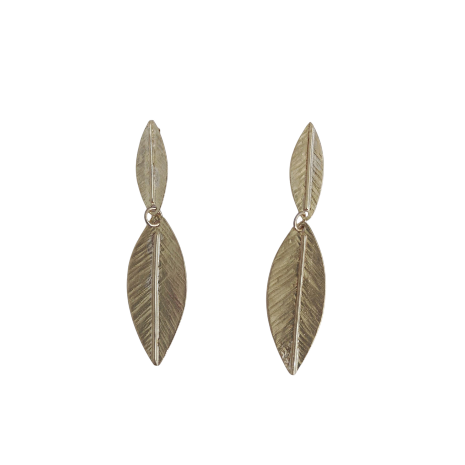 Pendientes artesanales que capturan la elegancia en su forma. Elaborados en bronce con técnicas clásicas de joyería, presentan dos hojas en tamaños distintos que crean un efecto visual cautivador. Equipados con palitos de plata 925 y cierre de silicona para máxima comodidad, incluyen protector libre de níquel que preserva el brillo original. Un accesorio versátil que realza y estiliza delicadamente los rasgos del rostro, perfecto para quien busca joyería con carácter y autenticidad.