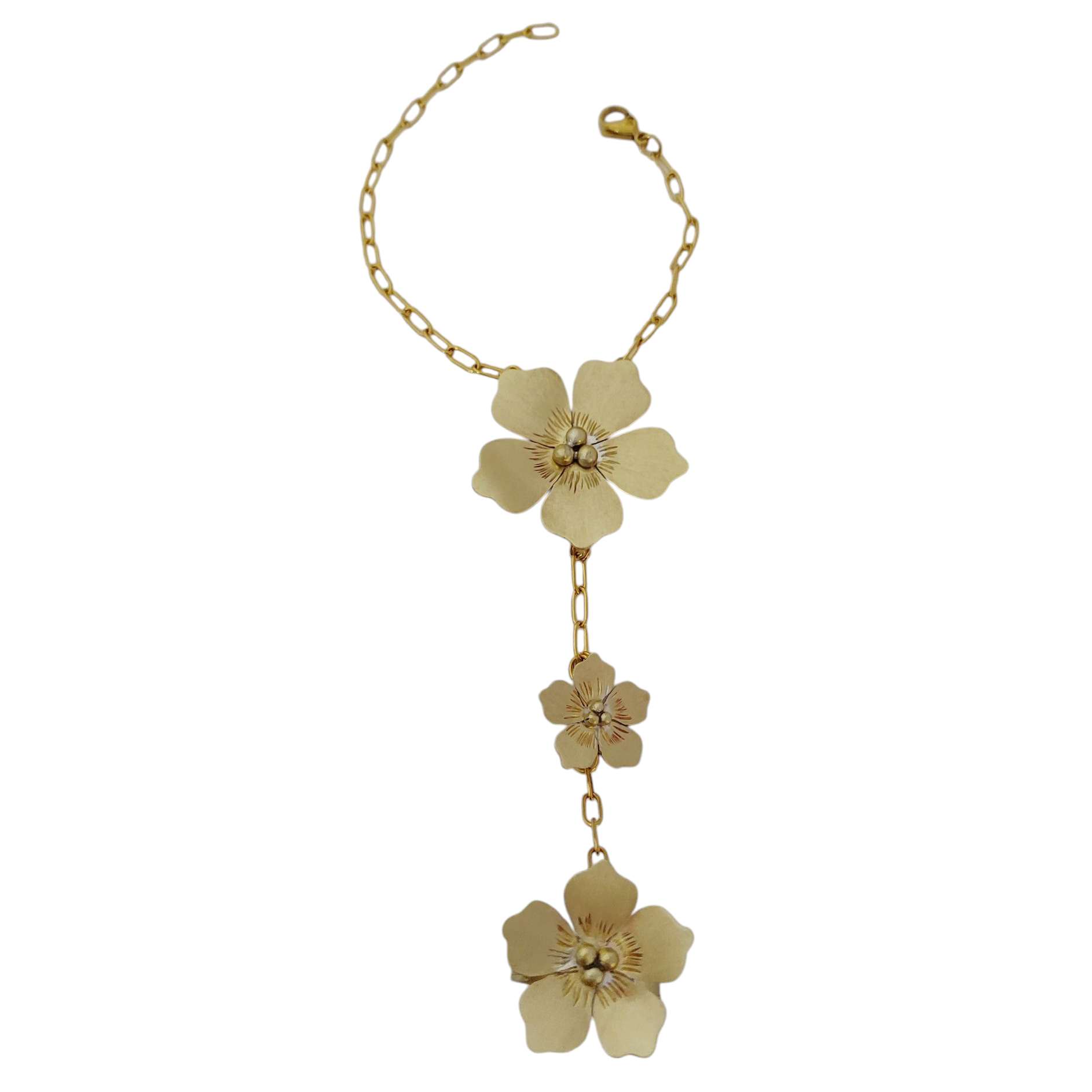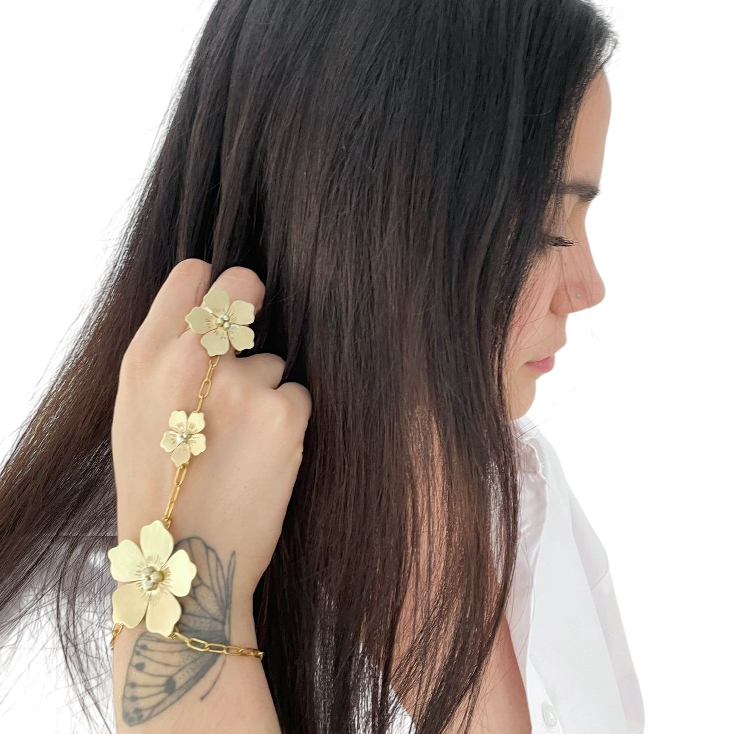 Descubre la elegancia artesanal con nuestra Pulsera Anillo Floreciendo, una pieza única trabajada completamente a mano con técnicas clásicas de joyería. Elaborada en bronce noble, combina un anillo adaptable con una cadena de eslabones amplios en acero inoxidable de alta calidad, permitiéndote ajustarla perfectamente a tu medida. Su protector libre de níquel para que no se oscurezca. Una joya versátil que refleja la dedicación del trabajo artesanal en cada detalle, ideal para quien valora la calidad y la autenticidad.